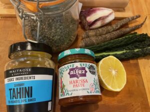 Equipment: large cooking pan, large and small bowls, sieve, measuring jug, food processor (or very sharp chopping knife… and some willing helpers!), rimmed oven baking tray, rectangular baking dish 30cm x 20 cm, and probaby a few other bits I’ve forgotten, but I’ve listed the stand-outs for me